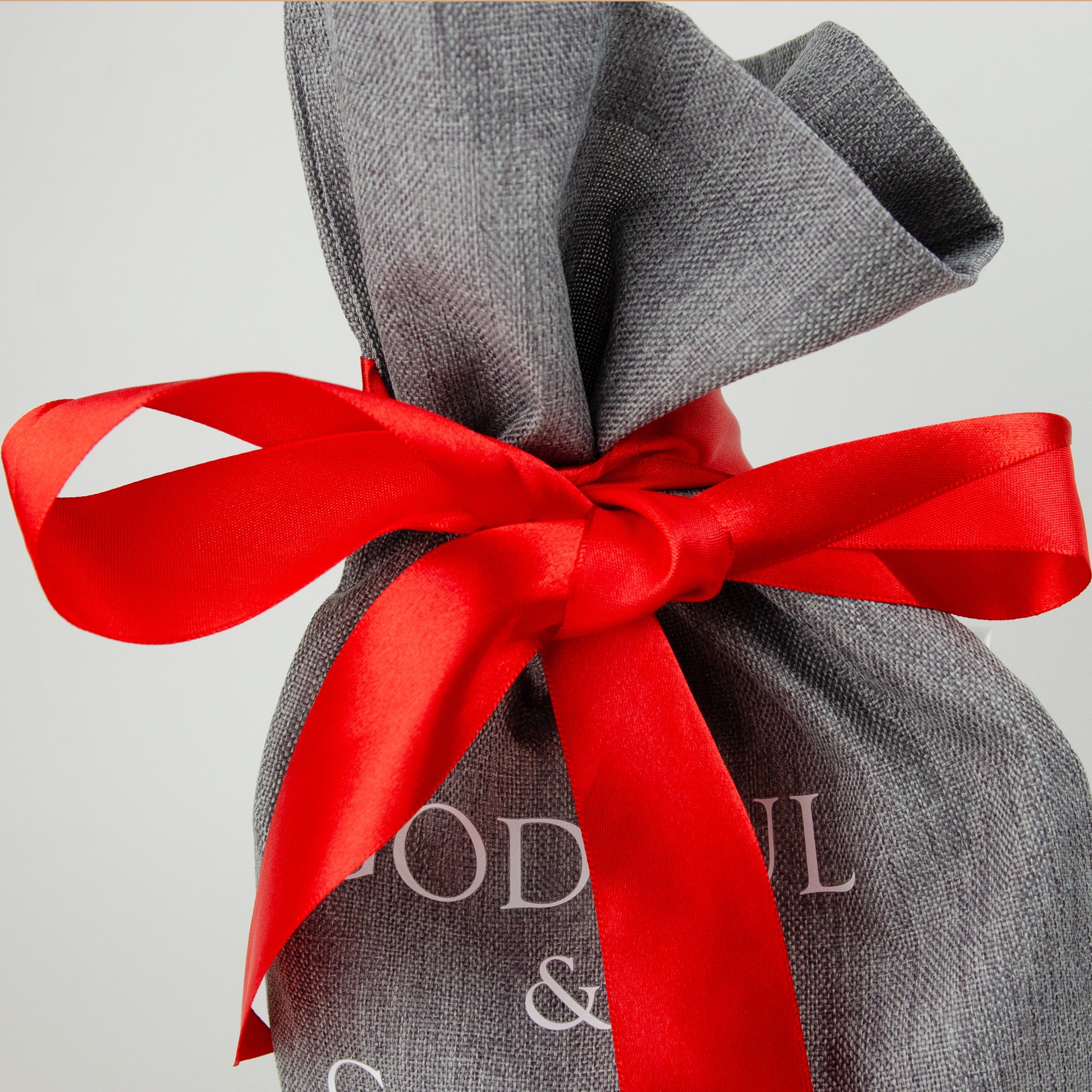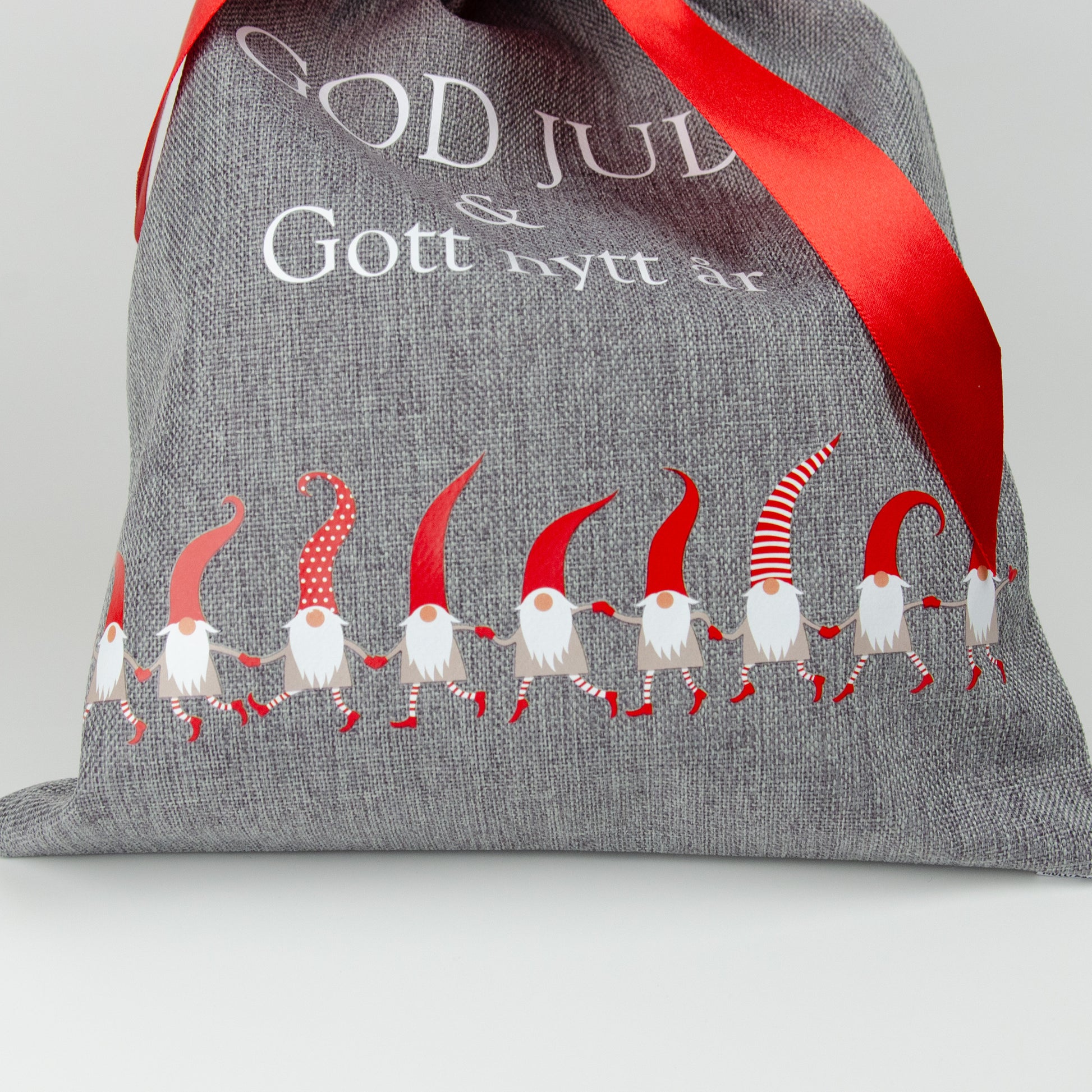 Julsäck - Jutesäck med dansande tomtar inklusive rött band för en snygg stängning av påsen!